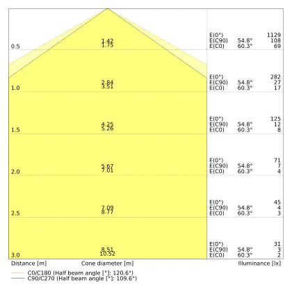 De lichtopbrengst (Lumen), geeft weer hoe krachtig het uitgestraalde licht is. Dit is belangrijk om te weten om de juiste sfeer te creëren. 0 tot 400 Lumen is bij uitstek geschikt voor accent- of sfeerverlichting. Een hoger aantal Lumen is, afhankelijk van de grootte van de ruimte, beter geschikt als ondersteunende- of basisverlichting. Heb je plafonds hoger dan 4 meter, dan is een lichtopbrengst van minimaal 8000lm aan te raden indien heldere verliching gewenst is (vb. in werkomgevingen).