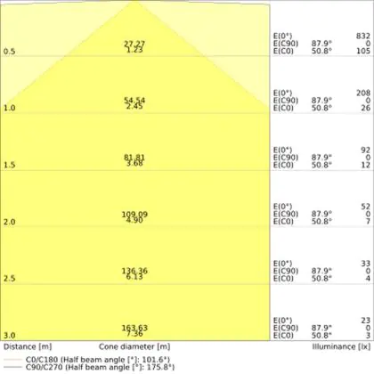 De lichtopbrengst (Lumen), geeft weer hoe krachtig het uitgestraalde licht is. Dit is belangrijk om te weten om de juiste sfeer te creëren. 0 tot 400 Lumen is bij uitstek geschikt voor accent- of sfeerverlichting. Een hoger aantal Lumen is, afhankelijk van de grootte van de ruimte, beter geschikt als ondersteunende- of basisverlichting. Heb je plafonds hoger dan 4 meter, dan is een lichtopbrengst van minimaal 8000lm aan te raden indien heldere verliching gewenst is (vb. in werkomgevingen).