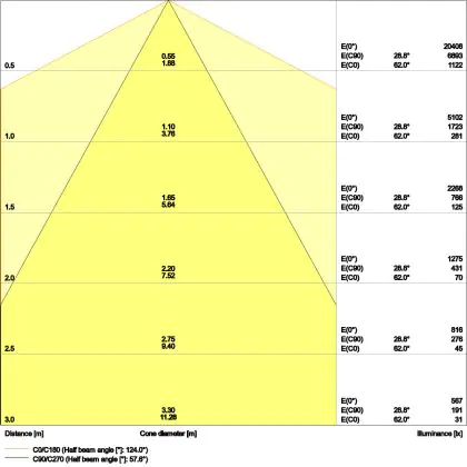 De gradenbundel geeft informatie over hoe breed het licht wordt uitgestraald. Dit zit tussen de 0 en 360 graden (D). Hoe kleiner de hoek, hoe specifieker de lichtbundel is. Over het algemeen is een smalle gradenbundel perfect voor sfeer- of accentverlichting, terwijl een brede gradenbundel ideaal is om grote oppervlaktes te verlichten.