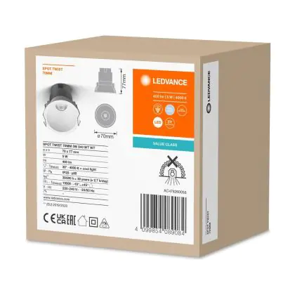 Beschrijving Ledvance LED Spot Twist Pro Aluminium Wit Reflector 5W 400lm 30D - 840 Koel Wit | 70mm - Zaagmaat 65mm - IP20