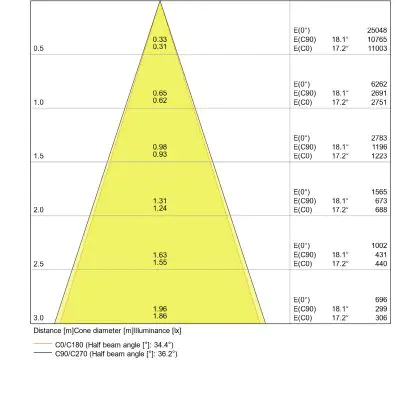 De lichtopbrengst en de gradenbundel spelen een grote rol. Zo geeft de lichtopbrengst van 2700 Lumen in combinatie met de 38° stralingshoek deze inbouwspot een specifieke toepassing. Kort samengevat is een lichtintensiteit van maximaal 400 Lumen ideaal voor accentverlichting, terwijl hogere waardes goed gebruikt kunnen worden als basisverlichting. Over het algemeen geldt: hoe breder de gradenbundel, hoe geschikter deze is door basisverlichting. Dit komt doordat het licht over een groter oppervlak wordt verspreid. Smallere gradenbundels (tot 40°) kunnen echter bij hoge plafonds ook goed tot hun recht komen als algemene verlichting.