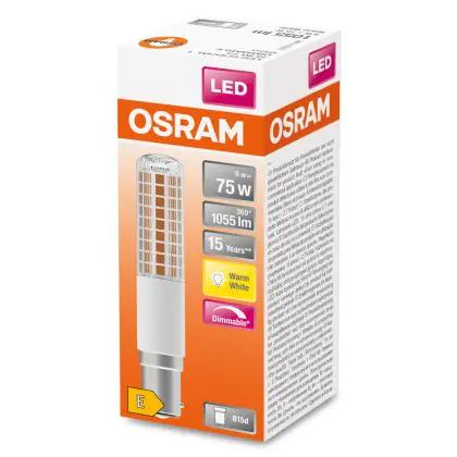Beschrijving Osram Special T Slim LED B15d Helder 9W 1055lm - 827 Zeer Warm Wit | Dimbaar - Vervangt 75W